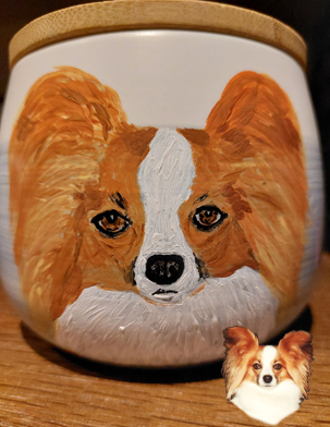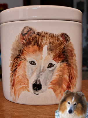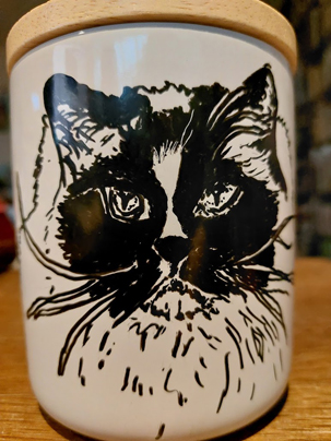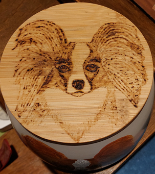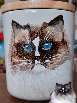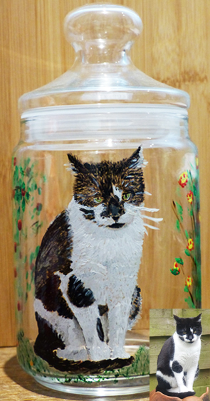 Bij de pot met kat Sisko heb ik het deksel gebrand met dezelfde foto en op de andere kant dezelfde foto alleen in zwartwit geschilderd als experiment.