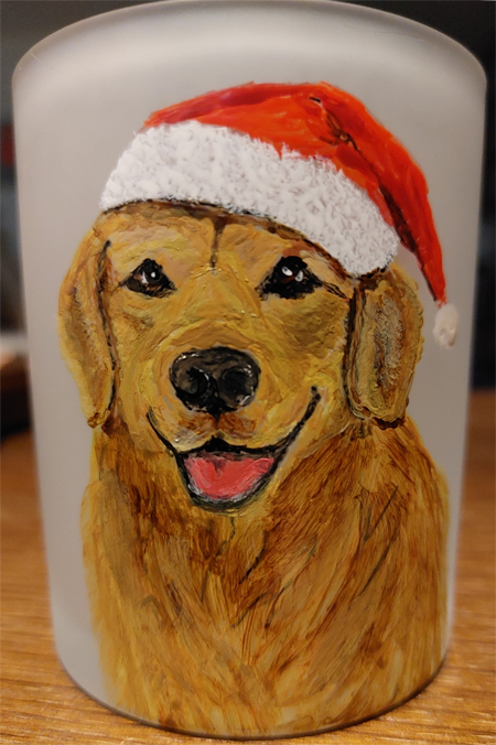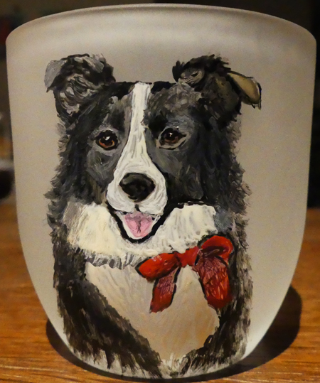 Waxinelichtjeshouder, aan één kant beschilderd met afbeelding kost 15 Euro. |
